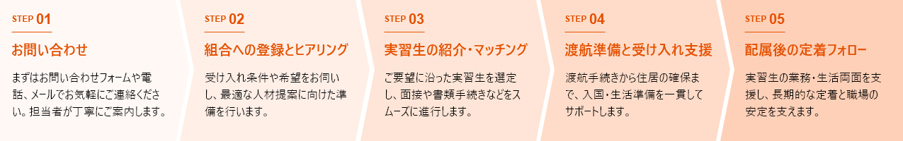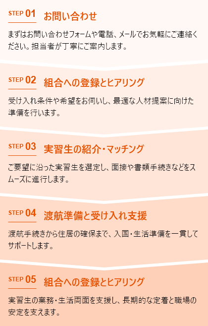 現地の信頼ある送り出し機関と直接連携しており、採用までの手続きもスムーズ。書類や面接の手配も代行し、質の高い人材を安定的にご紹介します。